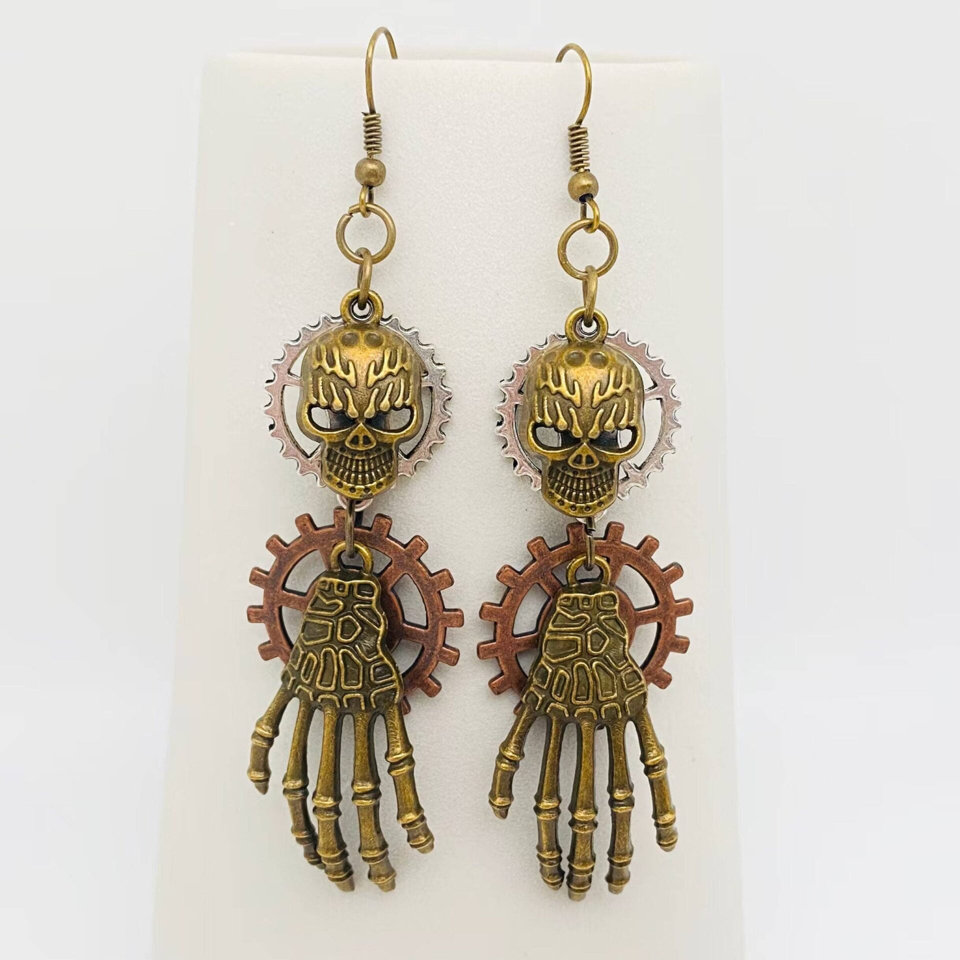 Steampunk Style Gear Skeleton Head and Hand Charm Earrings