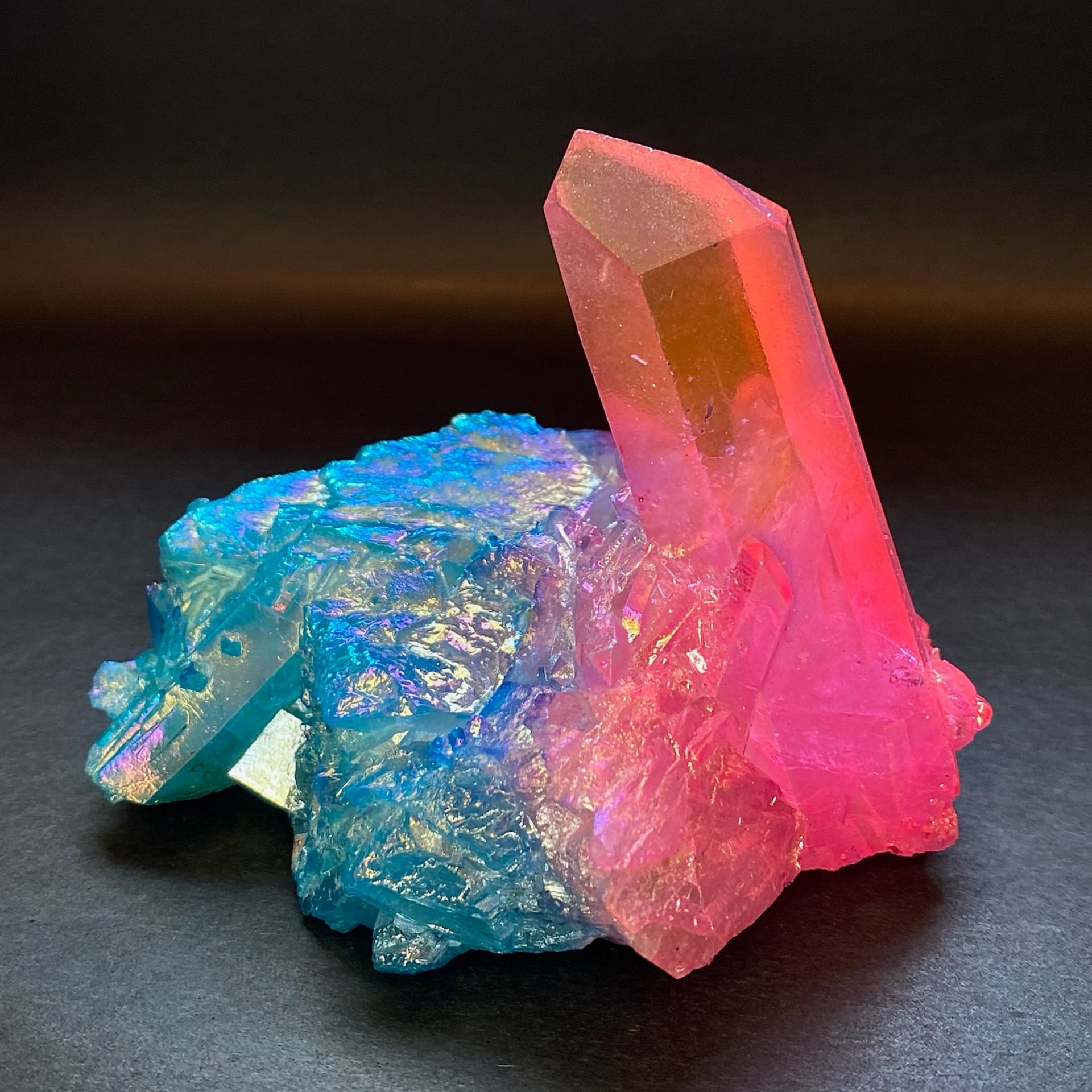 Enhance the natural beauty of your space with this stunning Aura quartz cluster. Known for its mesmerizing colors and unique formations, this raw specimen is not only a visual treat but also possesses powerful healing properties. Add a touch of magic to your collection with this extraordinary piece today!